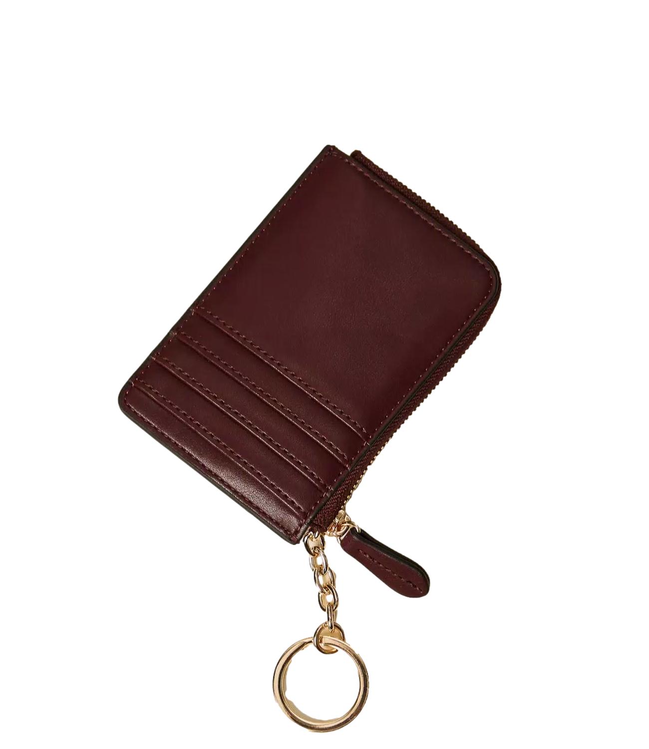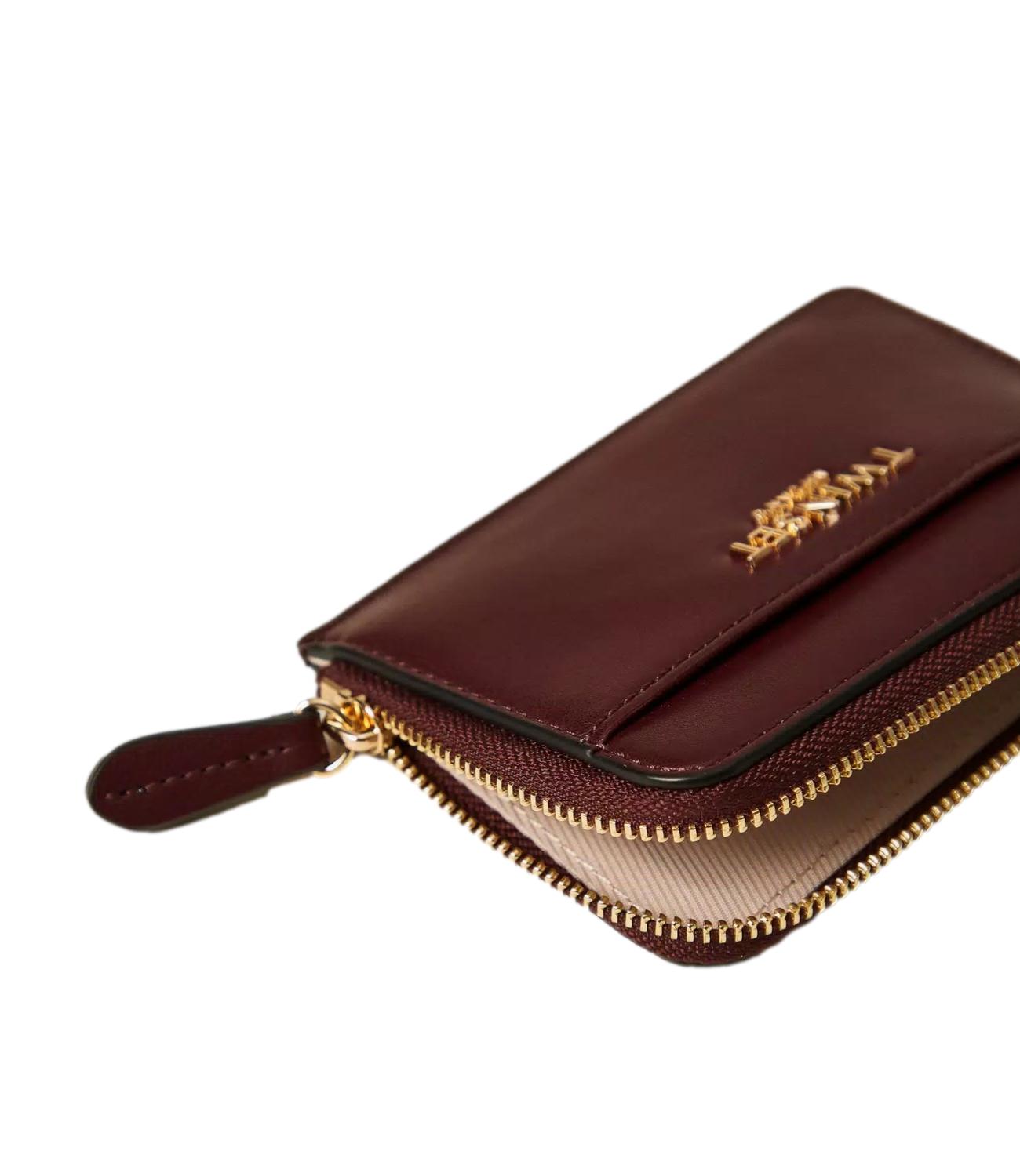 Portacarte effetto pelle di vitello liscio con logo lettering in metallo. Ha catena con anello portachiavi e zip a L con tasca per riporre chiavi e monete.