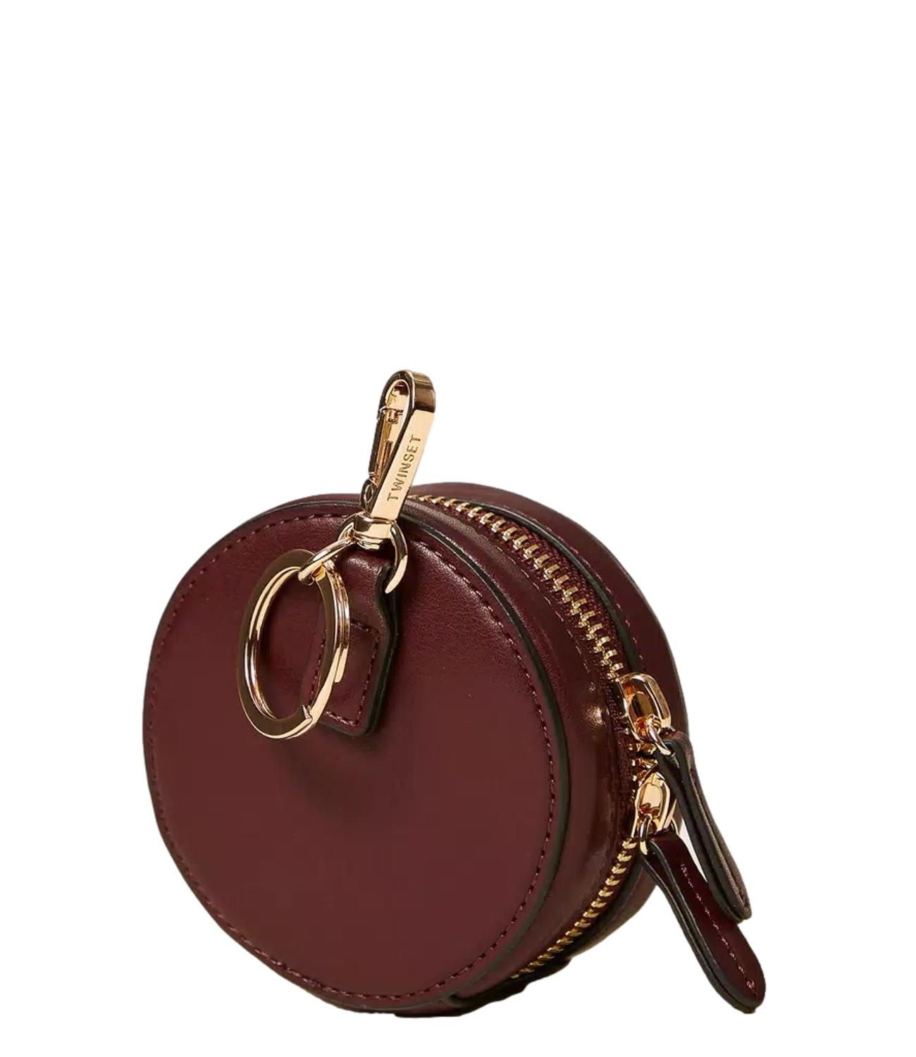 Portamonete effetto pelle di vitello liscio con logo lettering in metallo. Ha forma cilindrica, anello portachiavi e moschettone, chiusura con zip a doppio cursore.