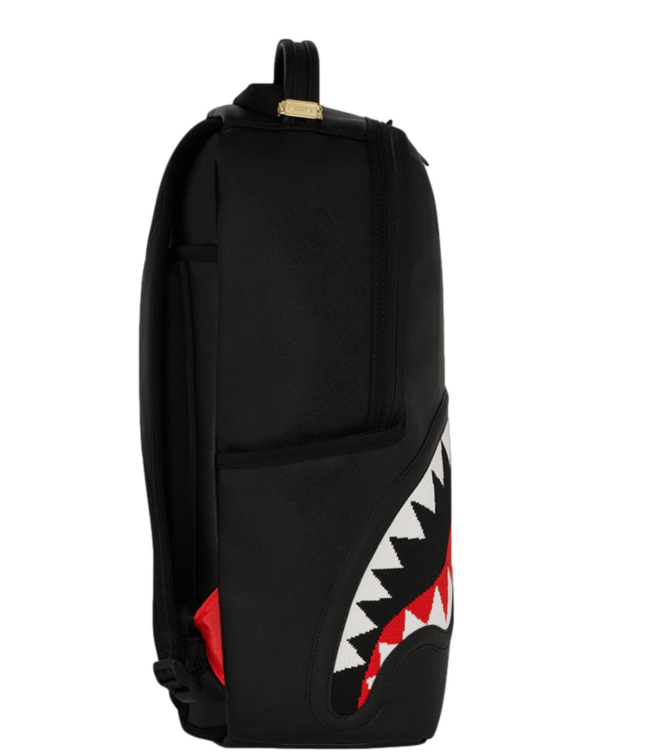 Zaino Sprayground nero black bocca shark su sfondo Vuitton in pelle poliuretana, Fly Knit Mouth Dlx Satin Backpack