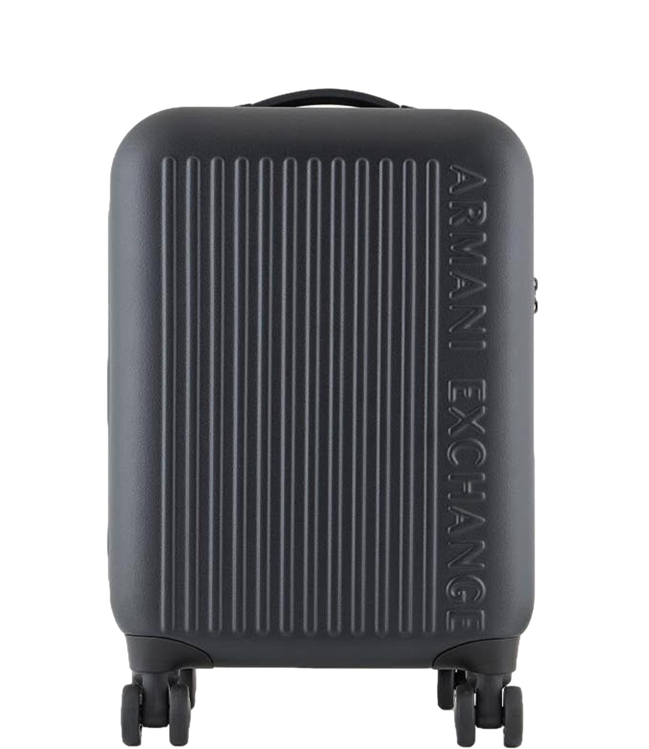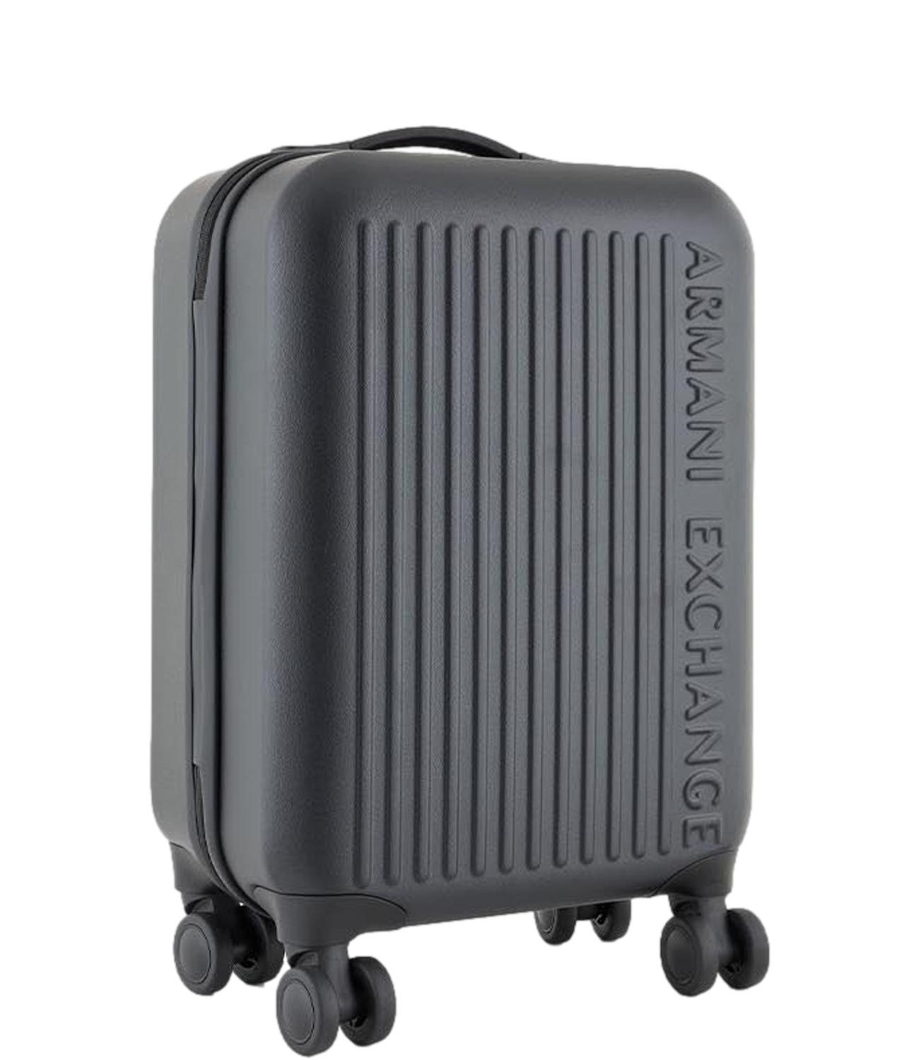 Trolley Armani Exchange nero con logo in rilievo, valigia da viaggio rigida con ruote