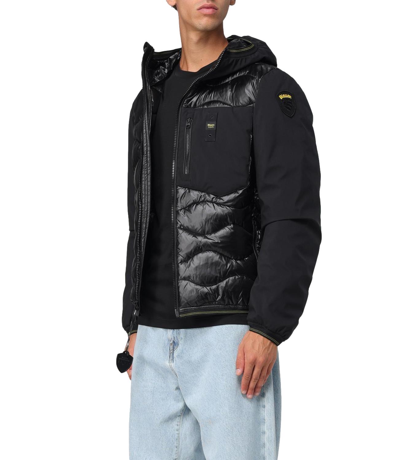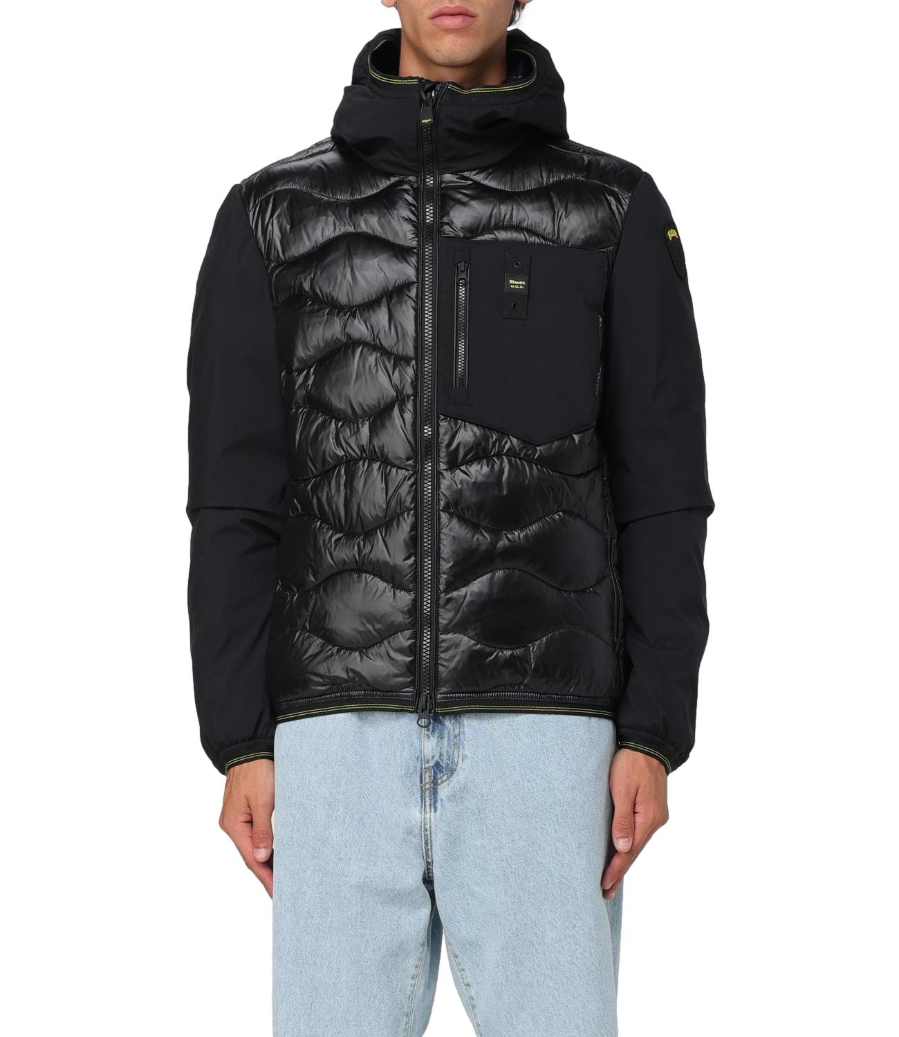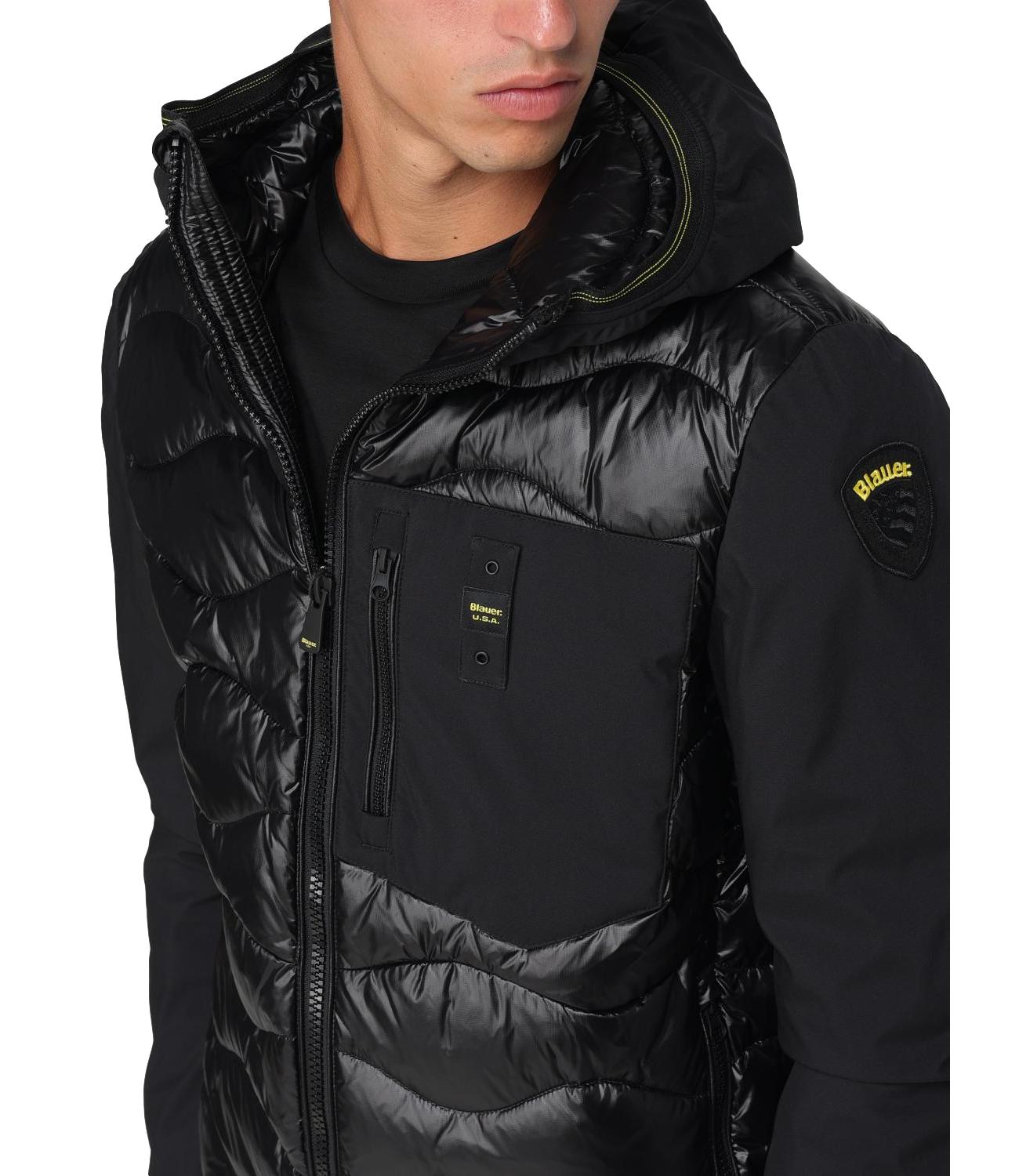 Piumino monocromatico in neoprene leggero e liscio sulle maniche e in nylon lucido impunturato ad onde sul corpo. Imbottitura mista per avere caldo anche in condizioni meteo avverse.
