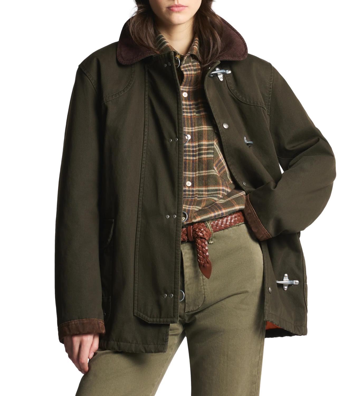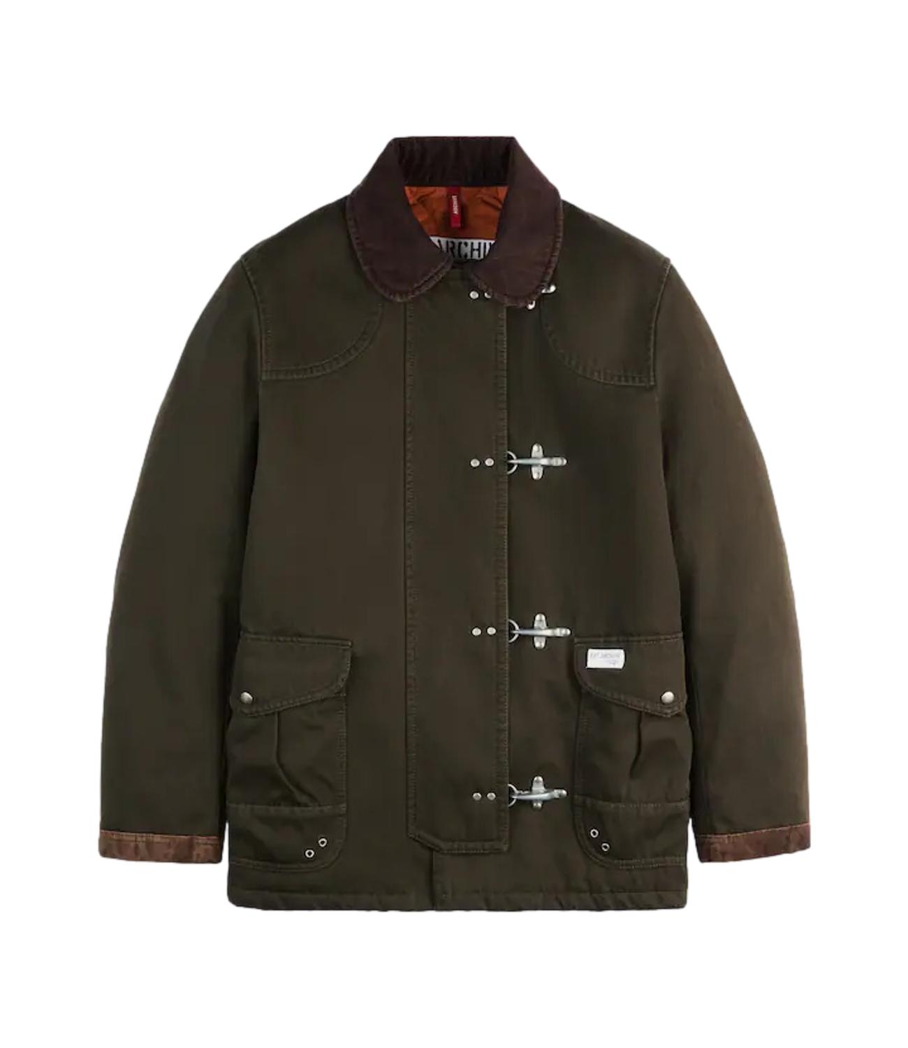 Simbolo del DNA workwear dagli anni Ottanta, il 4 Ganci si ispira alle divise dei pompieri americani e si distingue per la chiusura con ganci in metallo, dettagli in crosta e colletto in velluto. Questa versione in cover di cotone è imbottita in ovatta e foderata con trapuntatura a cipolla.