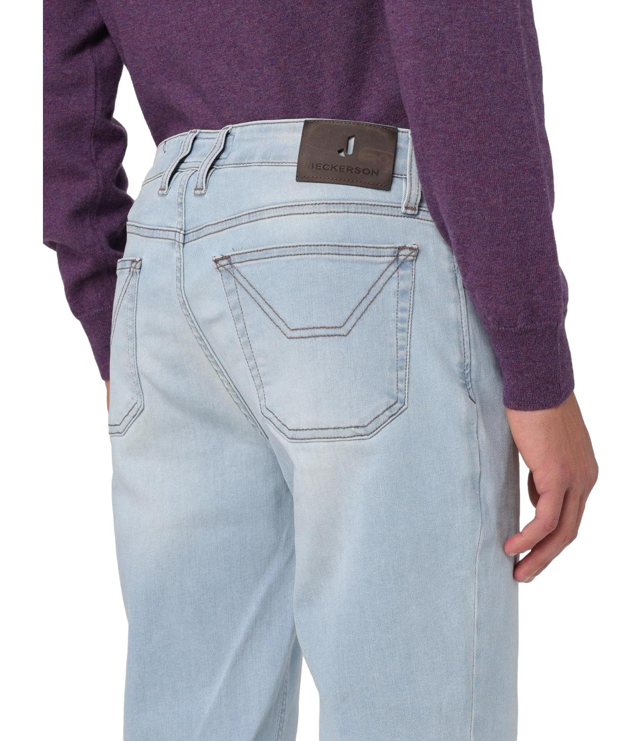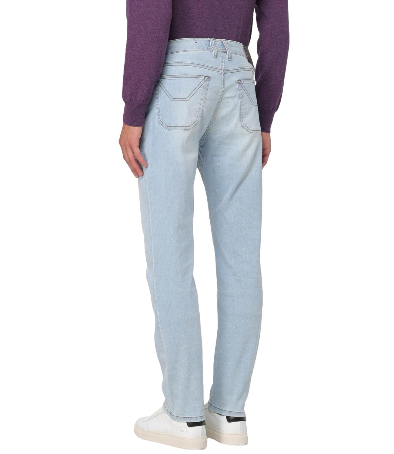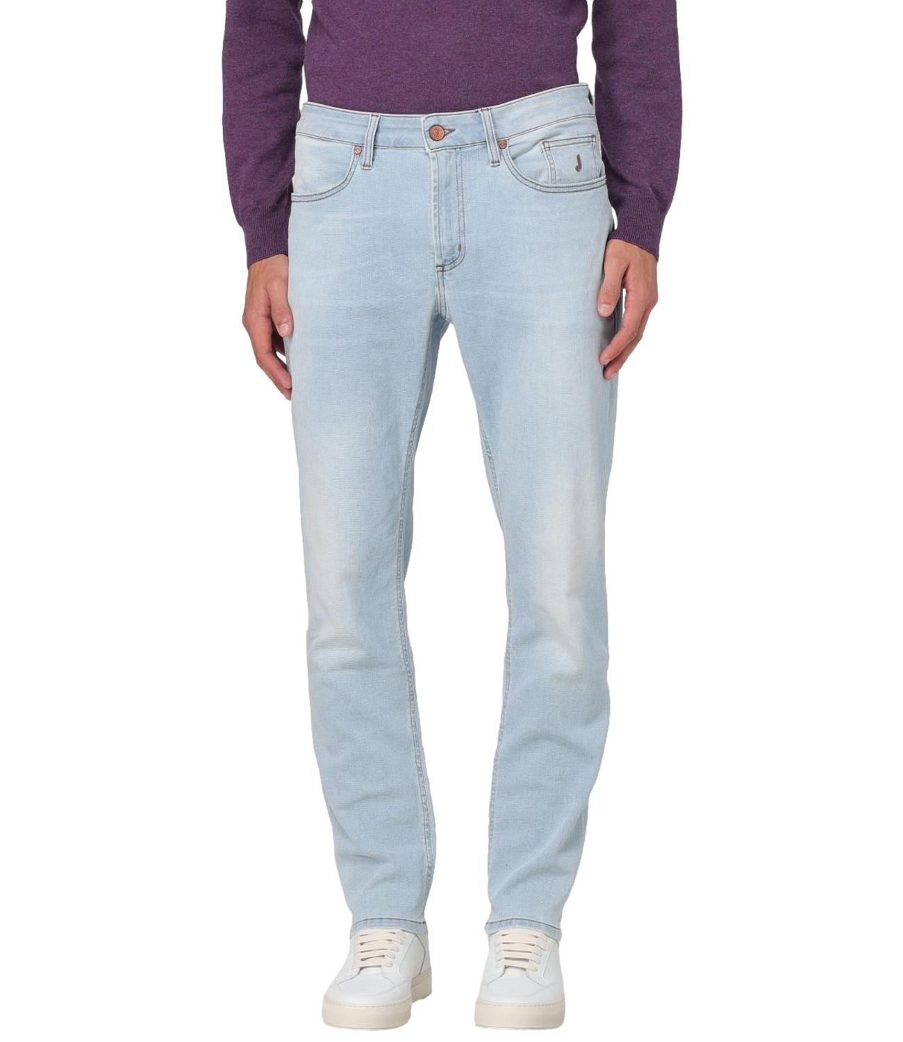 Pantalone 5 tasche slim fit realizzato in denim ecologico blu. Il capo è caratterizzato da salpa retrocinta in cuoio rigenerato, cintura interna che riporta il nome e il fit del modello ricamati in tono con le cuciture e logo J ricamato sul taschino sinistro.