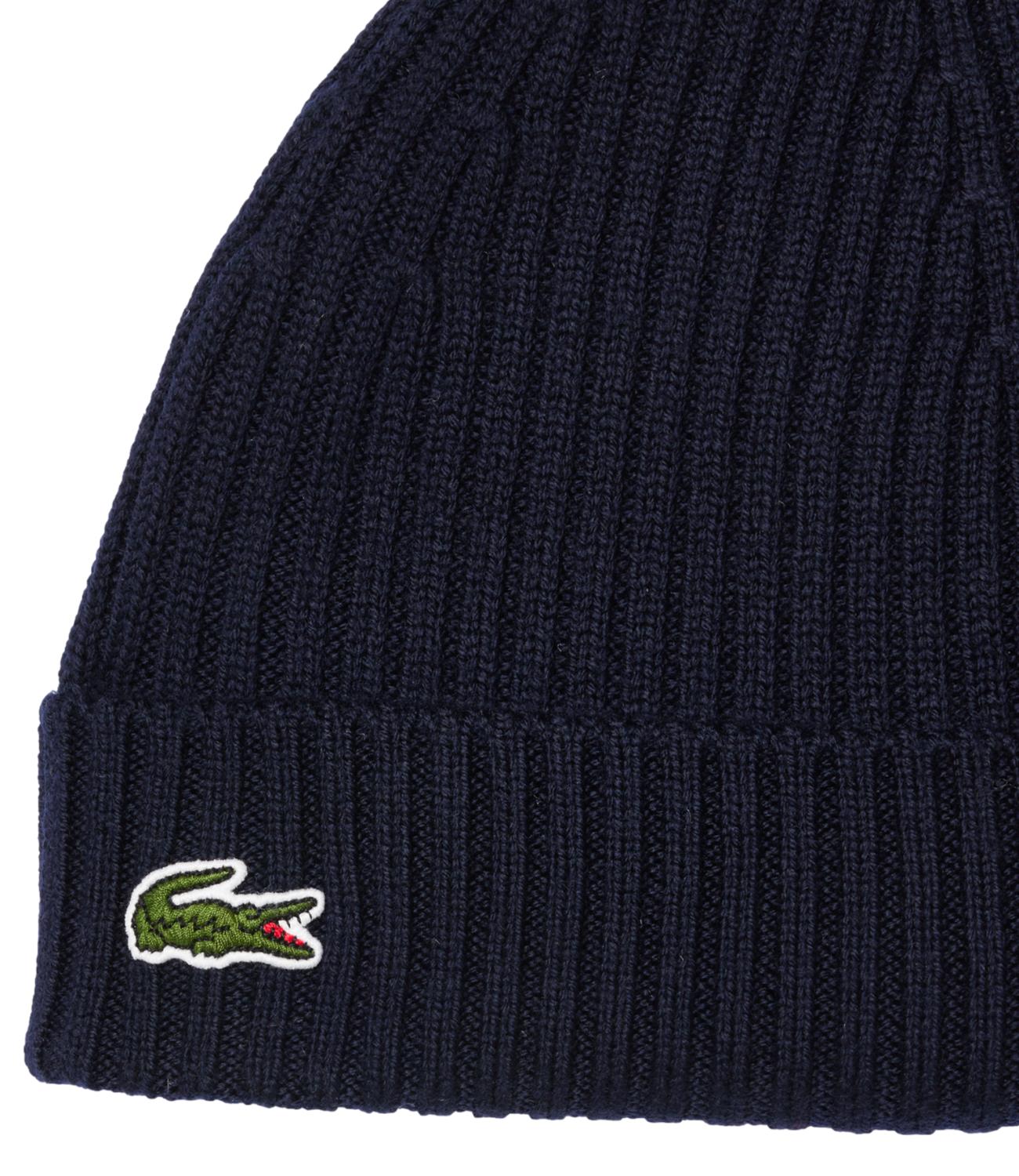 Lacoste Berretto in lana spazzolata a costine color blu navy con logo in rilievo