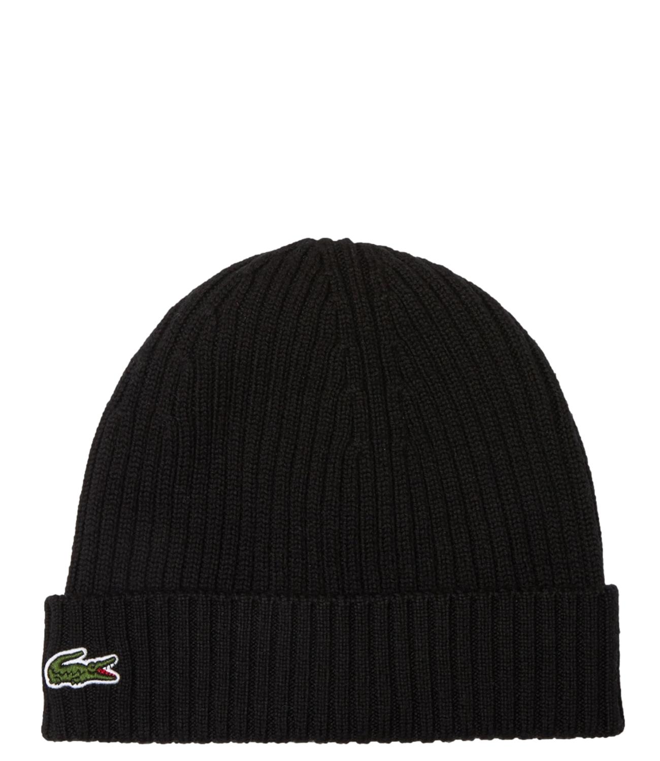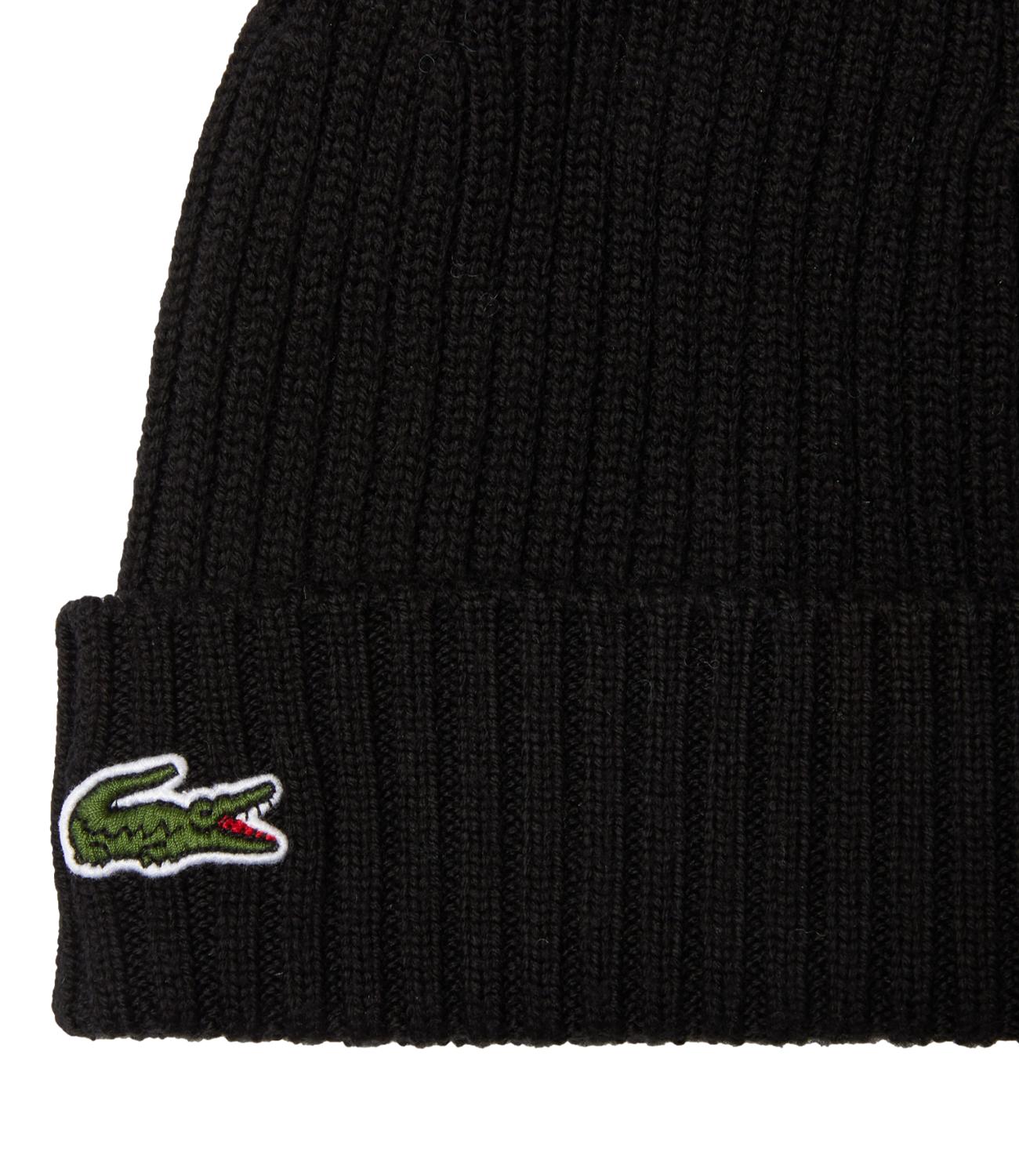 Lacoste Berretto in lana spazzolata a costine color nero con logo in rilievo