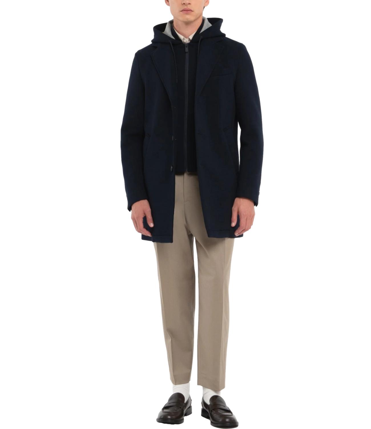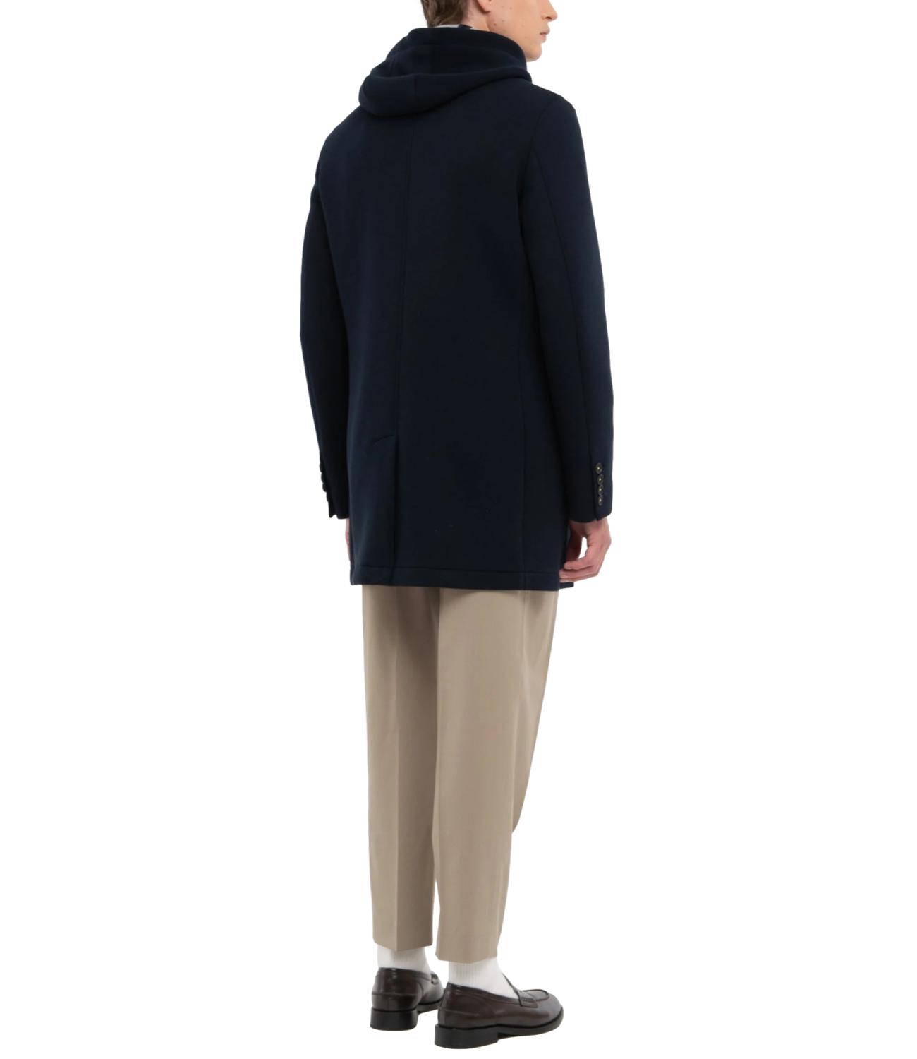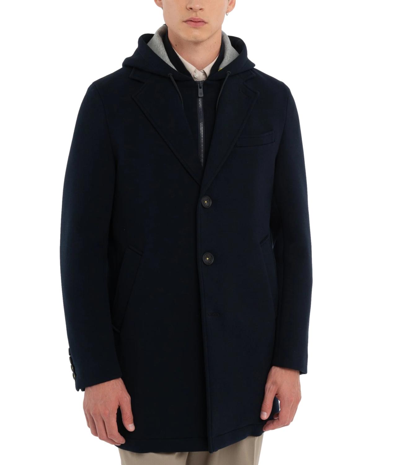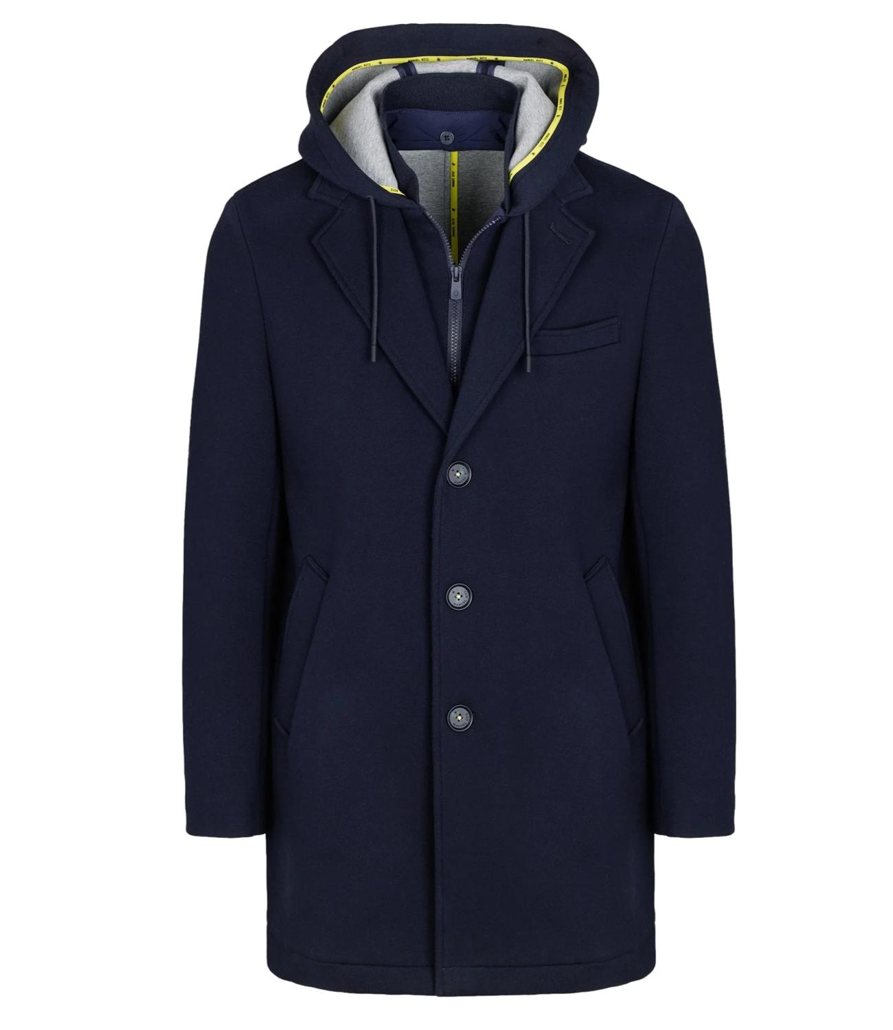 Cappotto da uomo realizzato in diagonale di jersey accoppiato con neoprene, dall'aspetto moderno e raffinato. È dotato di pettorina interna con cappuccio staccabili, che aggiungono praticità e un tocco sportivo al design. Presenta chiusura a tre bottoni, due tasche frontali e un taschino sul petto. Lo spacco centrale sul retro e le finiture con impunture a vista completano il look, garantendo stile e funzionalità.