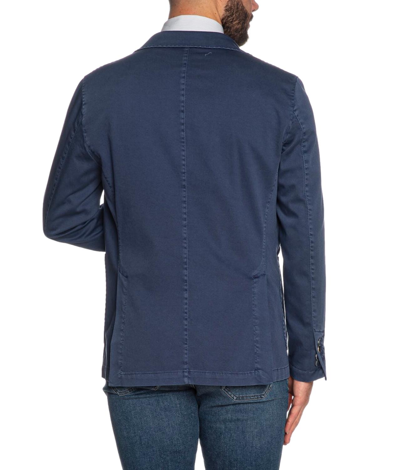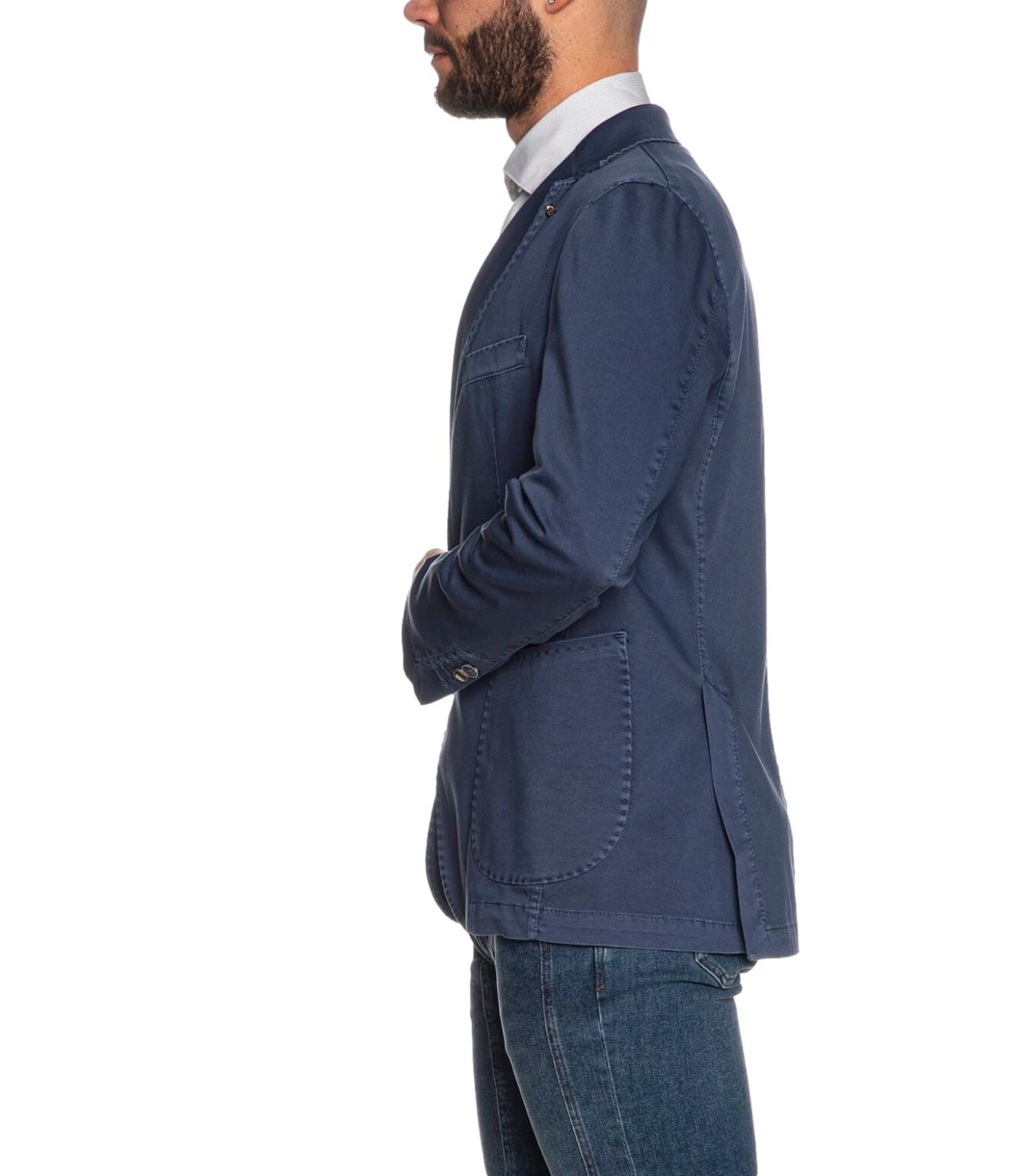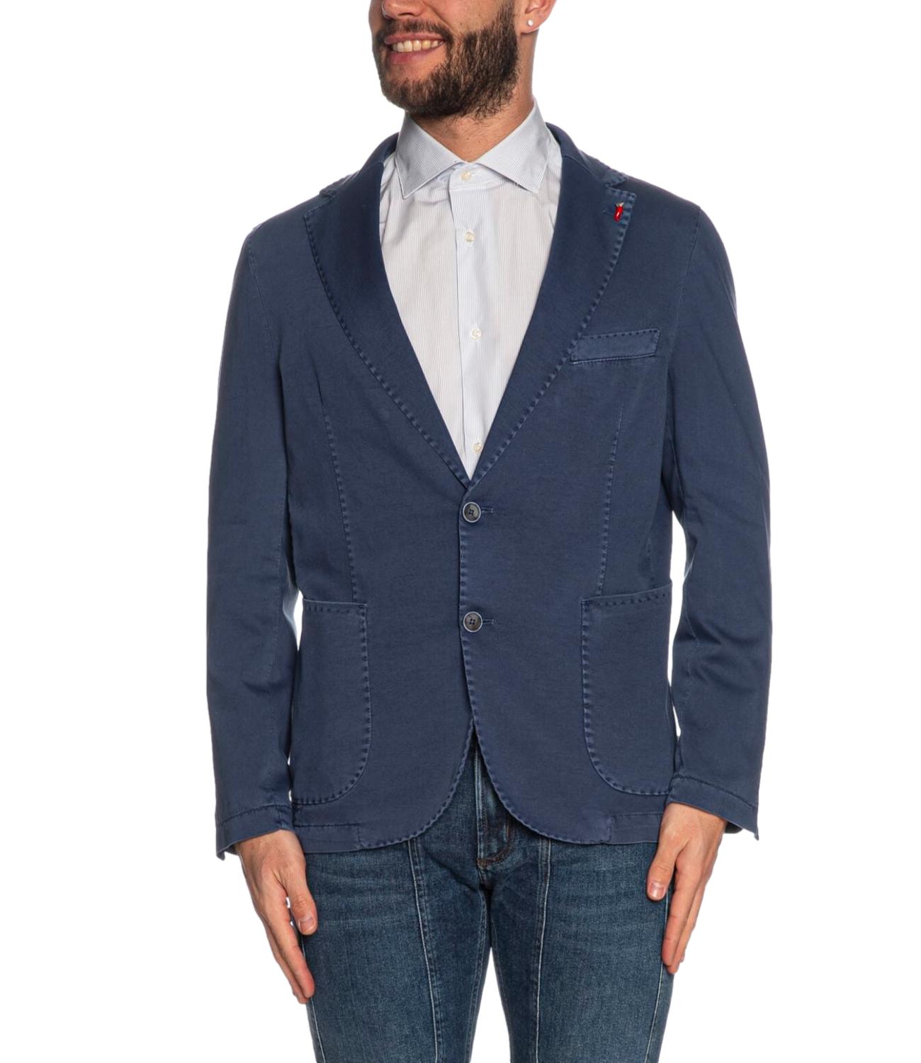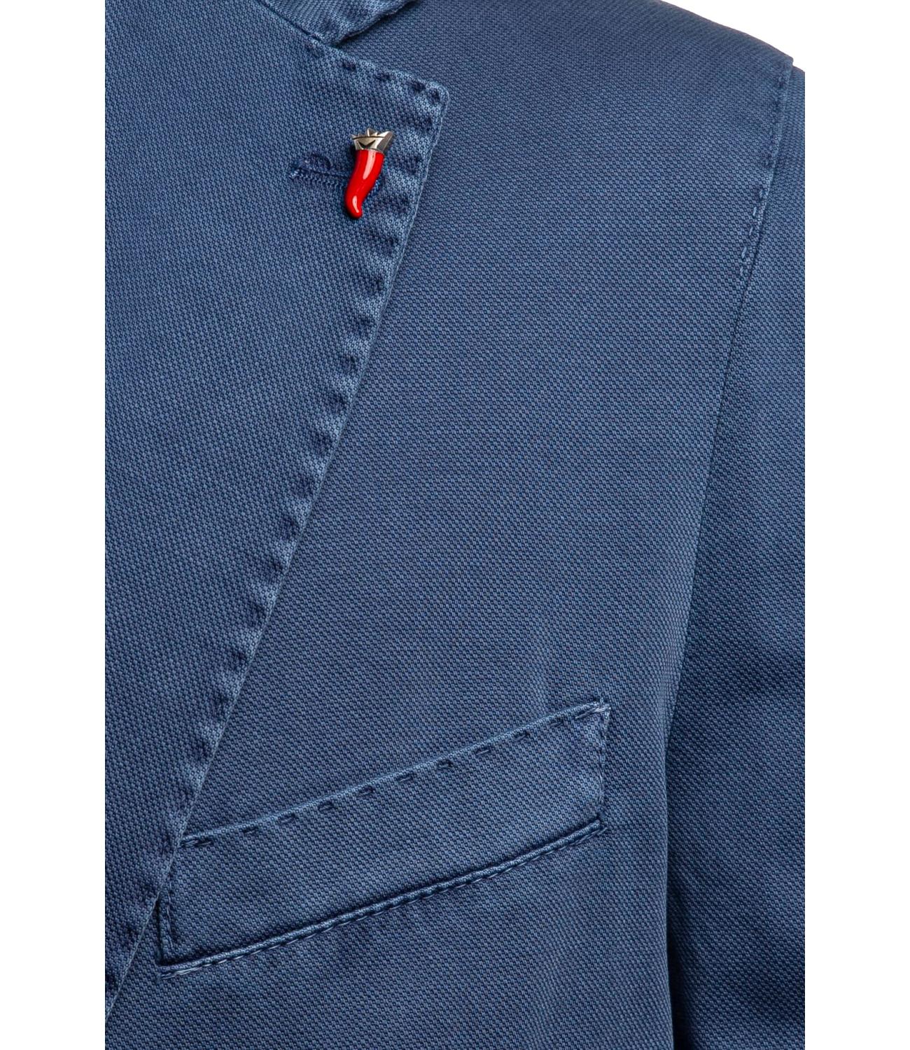Giacca Mulish Panarea da uomo in tessuto armaturato effetto piquet di cotone stretch tinto in capo per una finitura di colore unica, modello blazer drop 7 slim monopetto a due bottoni sfoderato, con revers classici impunturati tono su tono, tasche anteriori patch e tasca sul petto a filo, spilla peperoncino smaltato con chiusura a farfalla sull'asola, dettaglio bottone logato ai polsini e spacchetti posteriori