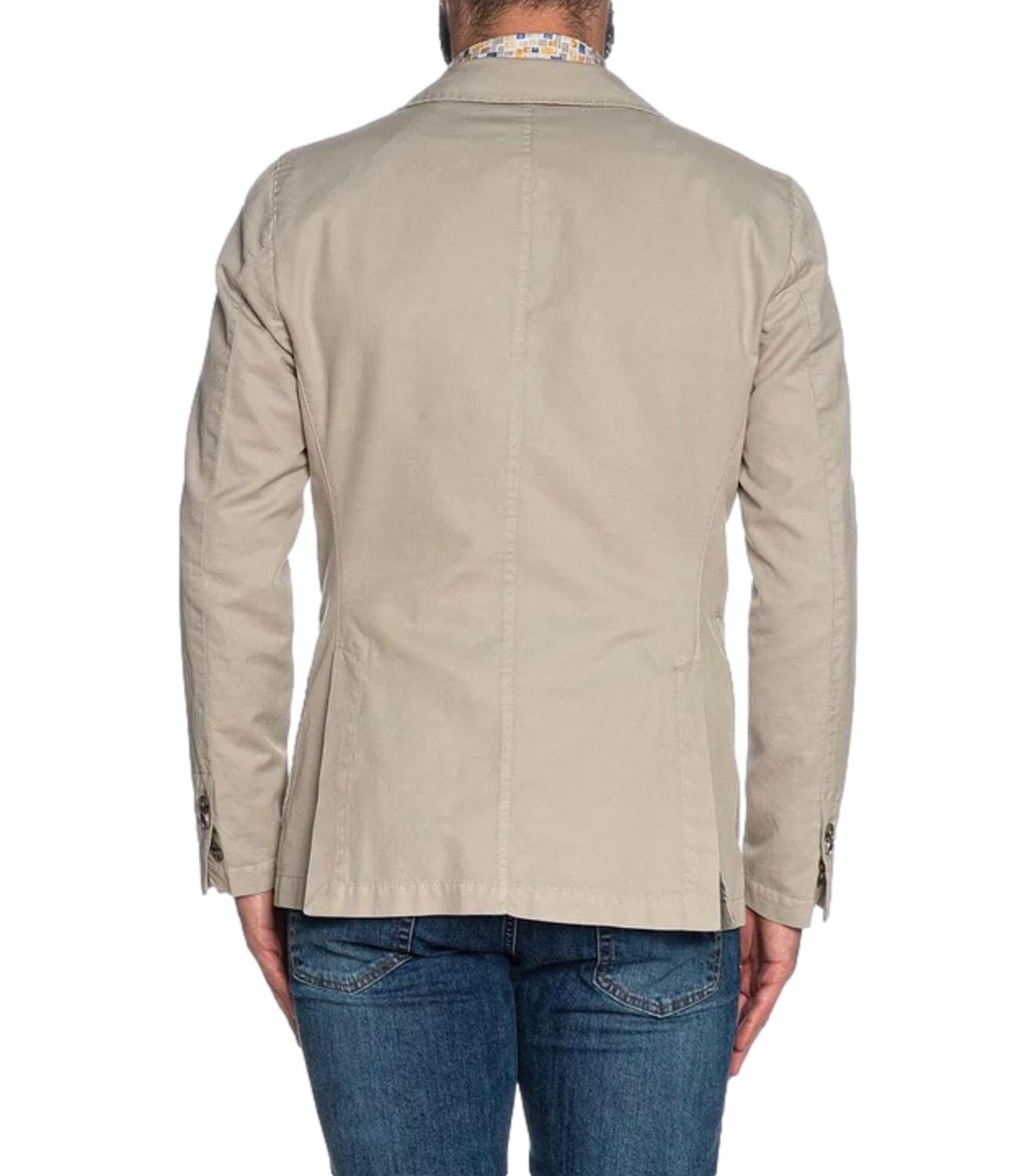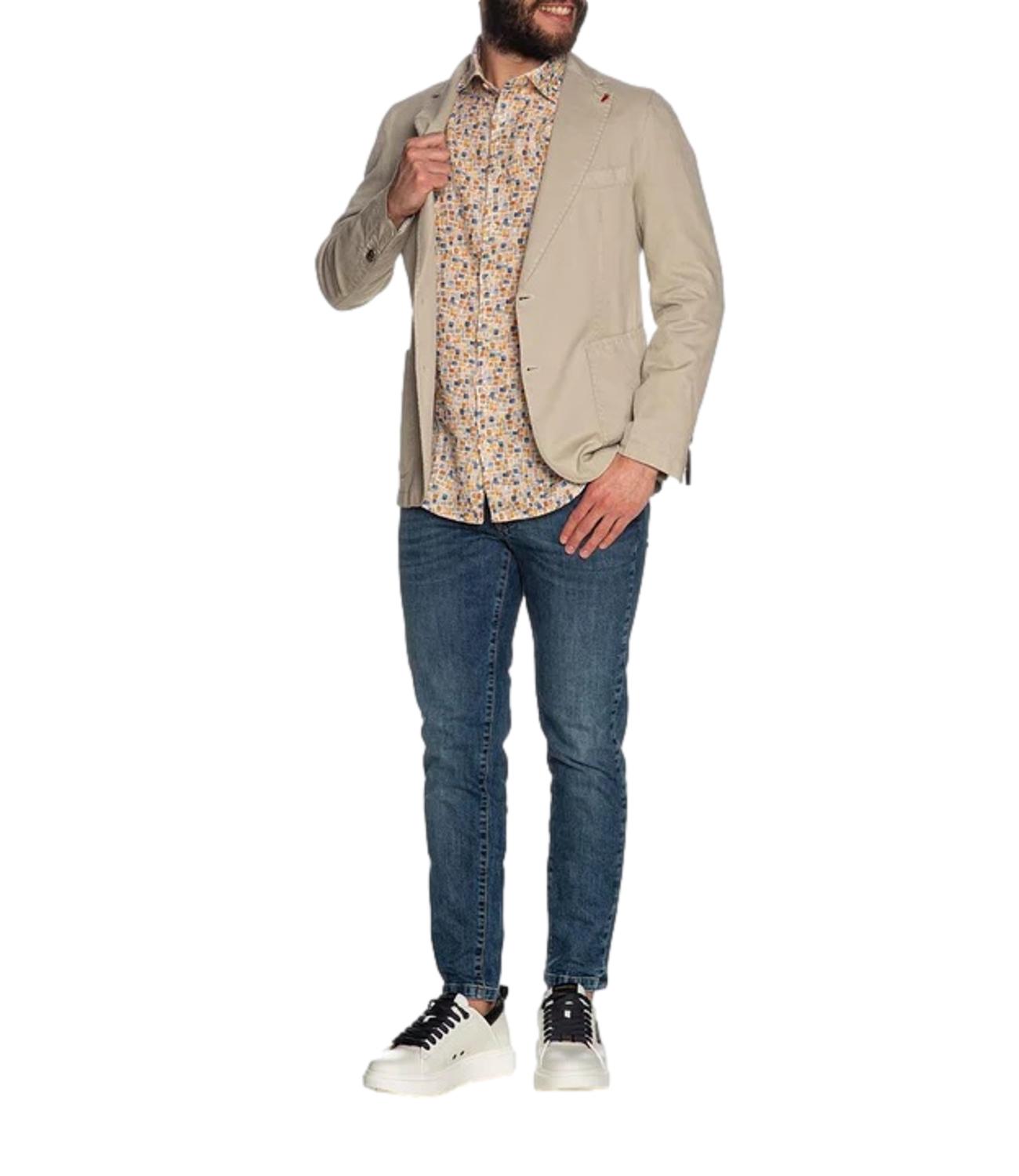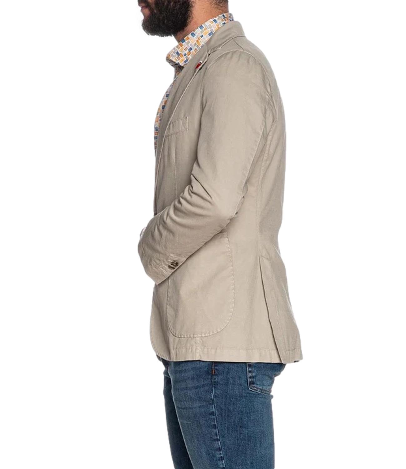 Giacca Mulish Panarea da uomo in tessuto armaturato effetto piquet di cotone stretch tinto in capo per una finitura di colore unica, modello blazer drop 7 slim monopetto a due bottoni sfoderato, con revers classici impunturati tono su tono, tasche anteriori patch e tasca sul petto a filo, spilla peperoncino smaltato con chiusura a farfalla sull'asola, dettaglio bottone logato ai polsini e spacchetti posteriori
