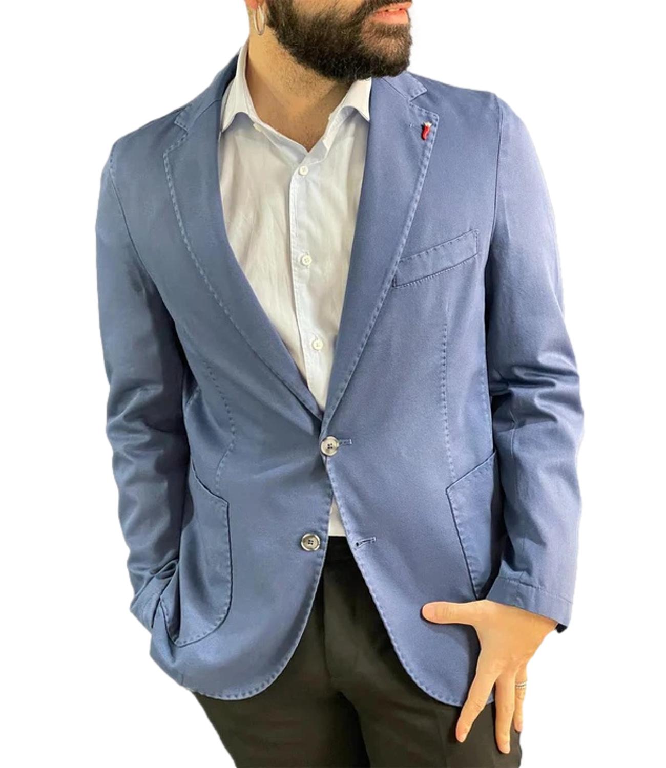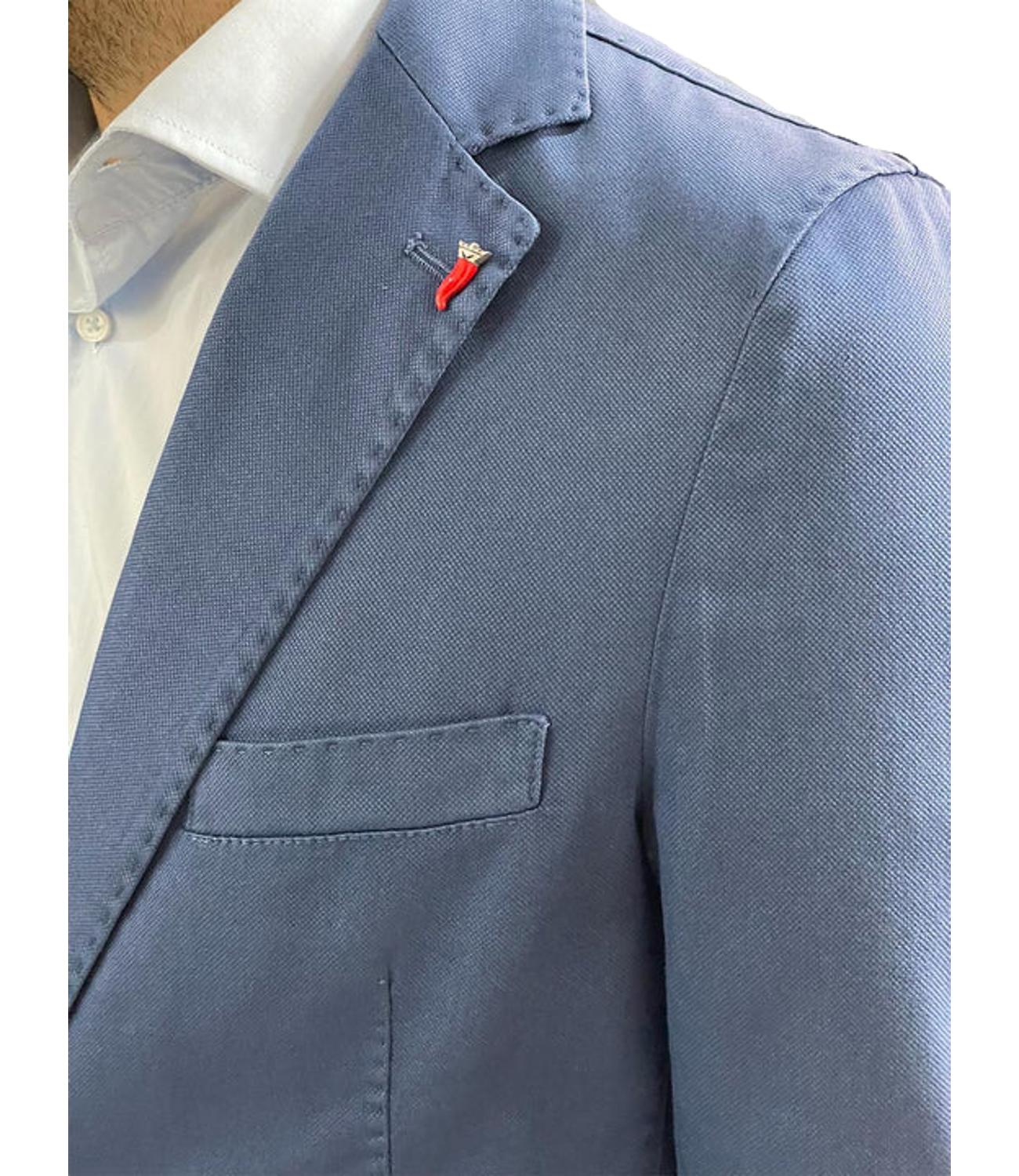 Giacca Mulish Juv da uomo in tessuto armaturato effetto piquet di cotone stretch tinto in capo per una finitura di colore unica, modello blazer drop 7 slim monopetto a due bottoni sfoderato, con revers classici impunturati tono su tono, tasche anteriori patch e tasca sul petto a filo, spilla peperoncino smaltato con chiusura a farfalla sull'asola, dettaglio bottone logato ai polsini e spacchetti posteriori