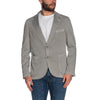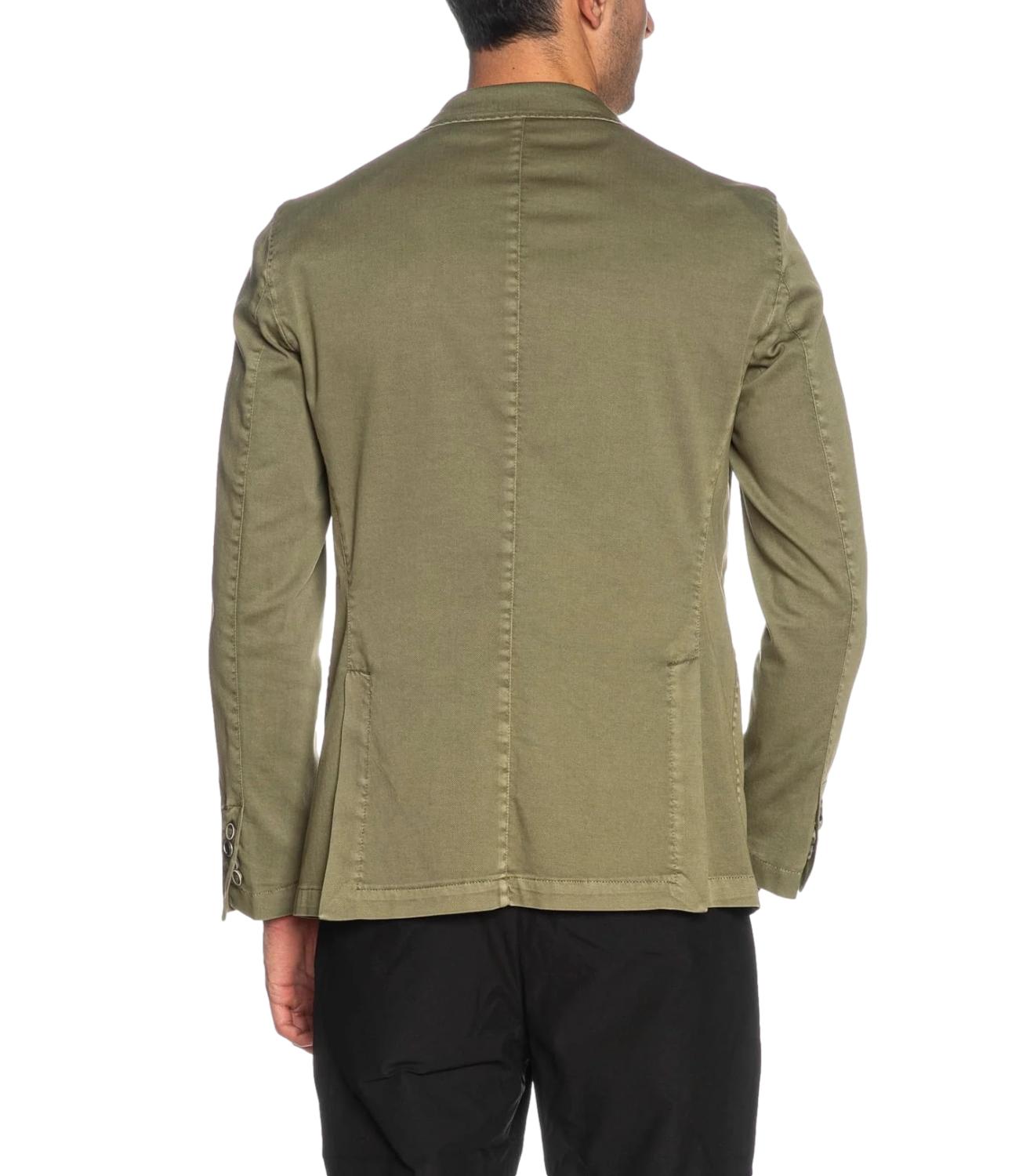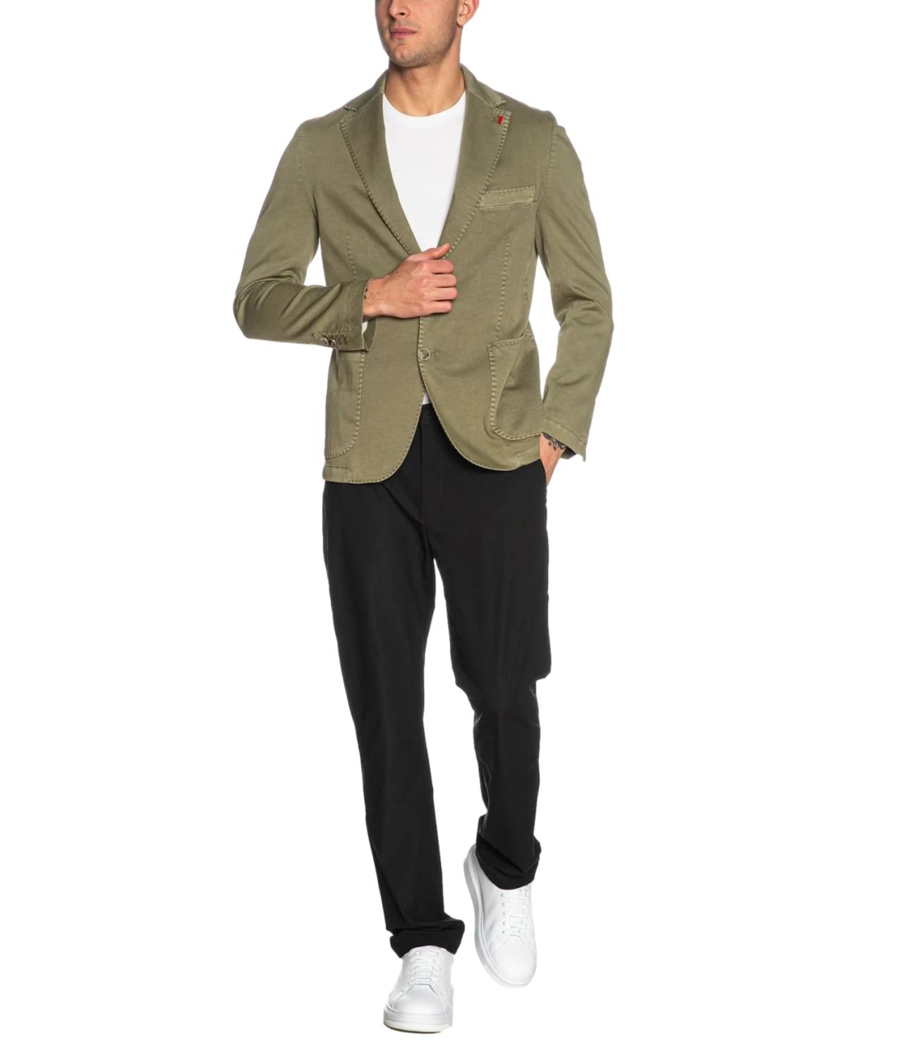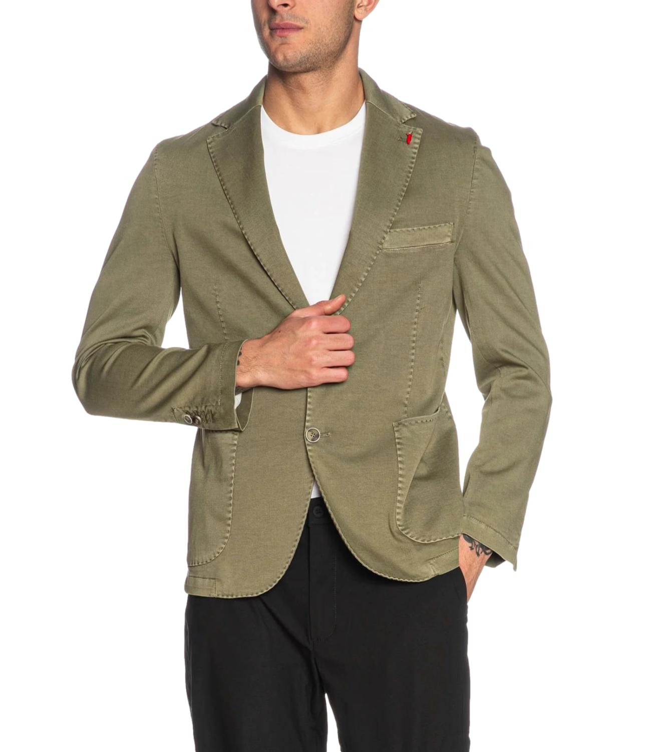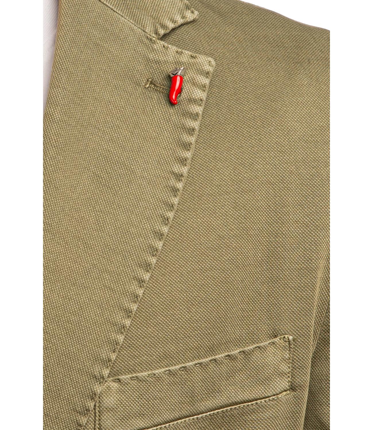 Giacca Mulish Panarea da uomo in tessuto armaturato effetto piquet di cotone stretch tinto in capo per una finitura di colore unica, modello blazer drop 7 slim monopetto a due bottoni sfoderato, con revers classici impunturati tono su tono, tasche anteriori patch e tasca sul petto a filo, spilla peperoncino smaltato con chiusura a farfalla sull'asola, dettaglio bottone logato ai polsini e spacchetti posteriori