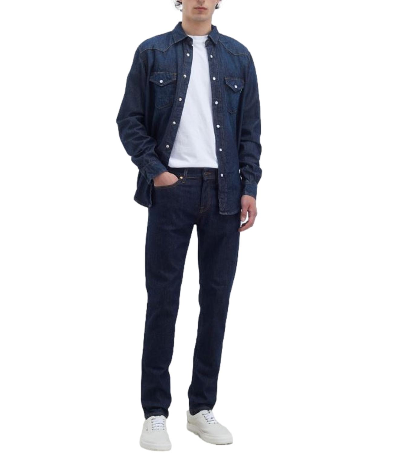 Jeans in denim con lavaggio scuro. Vita media con passanti e salpa applicata sul retro. Chiusura con bottone logato e zip. Due tasche sul fronte e due tasche sul retro con label Roy Roger's applicata. Slim fit.