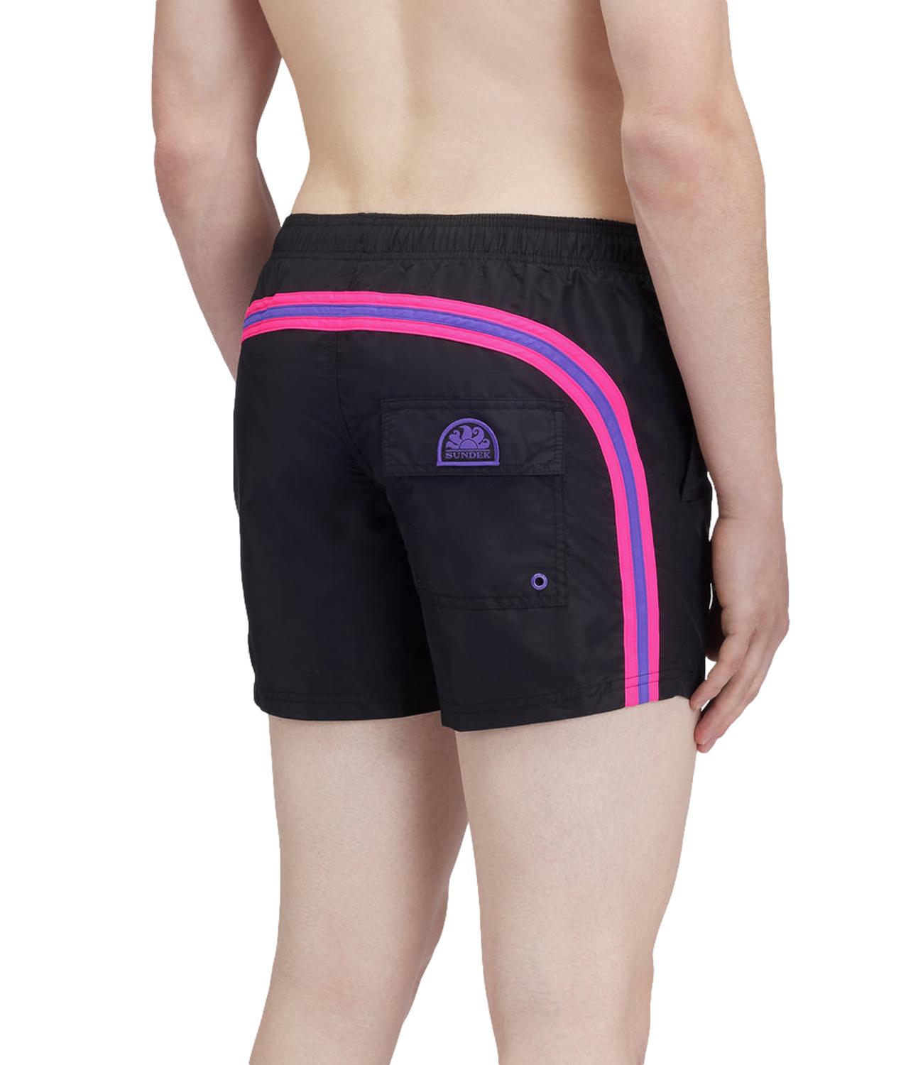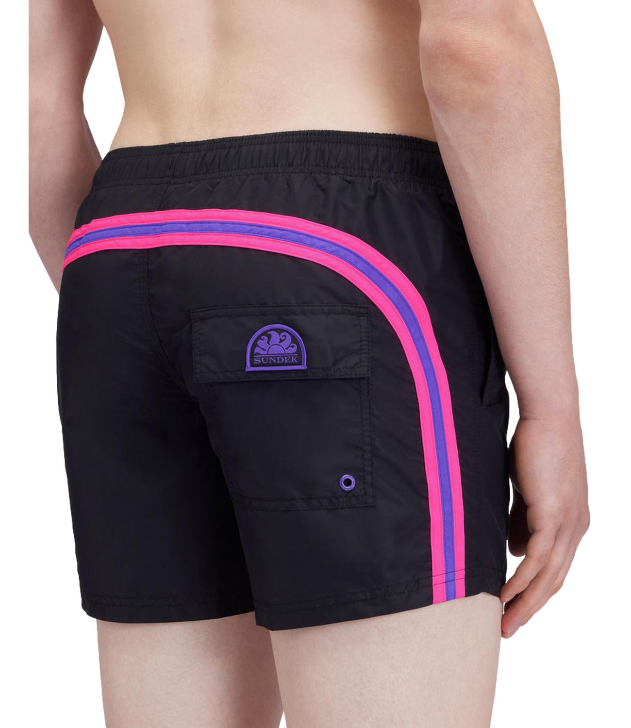 Shorts uomo mare corto e con vita elasticata, coulisse e arcobaleno Sundek a doppio colore (2 strisce uguali e una terza nel mezzo). Questo costume è realizzato con cuciture a tre aghi e al 100% con il nostro tessuto storico, il nylon-taffetà: liscio come la seta, leggero e resistente a tutto, si asciuga velocissimo per darti comodità ovunque, tra le onde e fuori dall'acqua.