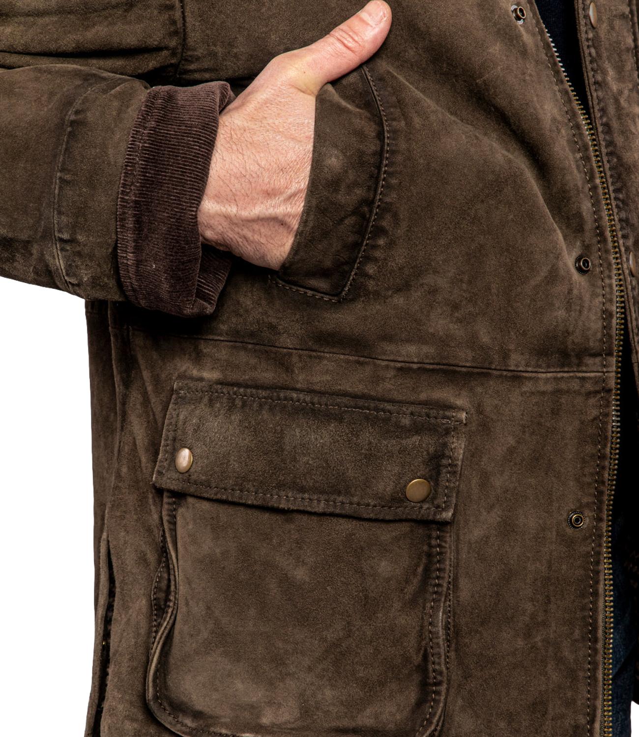 Giubbino di pelle semi lungo con tasche applicate e bottoni a clip. Lunghezza media leggermente stondato.